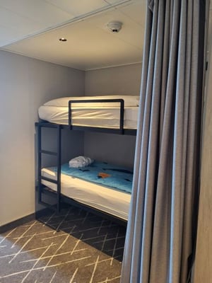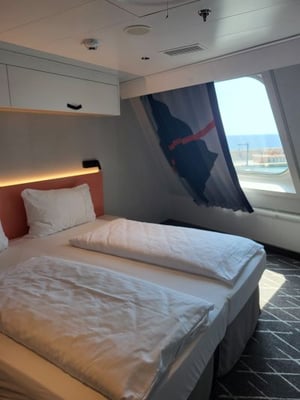 Unsere Wahl fiel auf eine Familienkabine auf Deck 7, mit großem Panoramafenster und traumhaftem Meerblick – wirklich wunderschön! Doch nach der ersten Nacht offenbarte sich eine Herausforderung: Die Kabine liegt direkt über dem Crew Deck und ist daher extrem hellhörig.